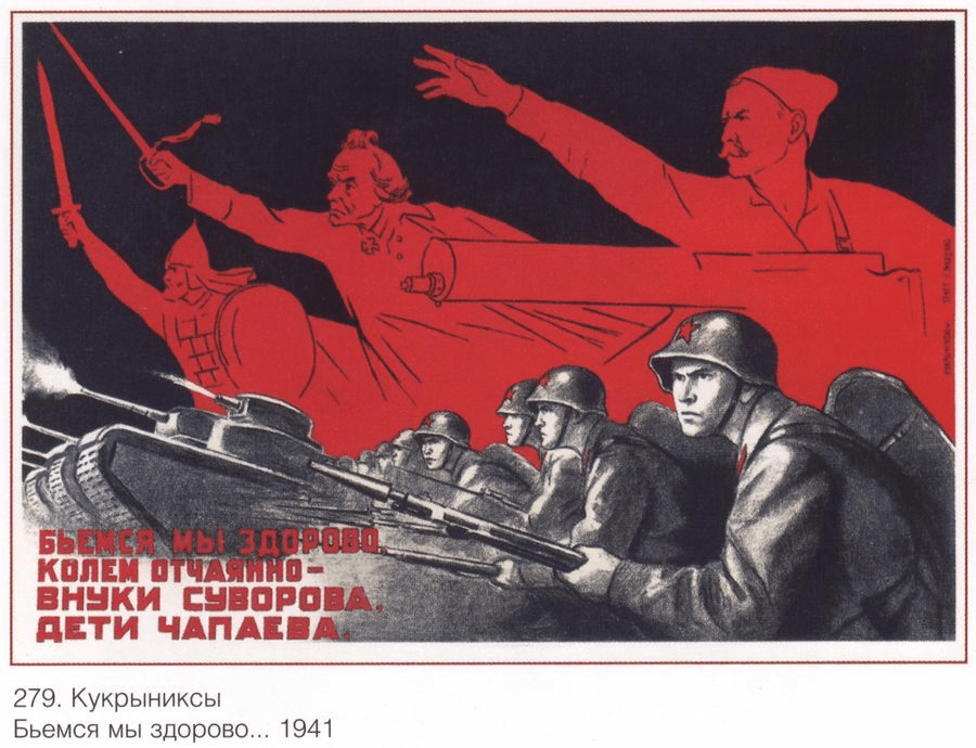 Как видим, сталинский режим вынужден был играть на двух разных клавишах, обращаясь то к националистическим, то к интернационалистским чувствам советских граждан, то к революционной, то к имперской отечественной традиции. Пожалуй, очевиднее всего противоречивость этого посыла выражена в знаменитом плакате от Кукрыниксов.